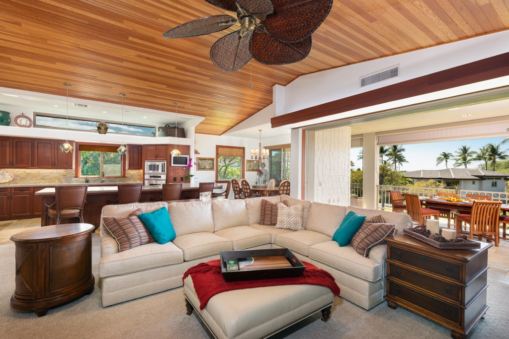The spacious Maile Plan at The Villages at Mauna Lani offers stunning golf course views, a 30-panel PV Solar system, and dual master suites. Enjoy the upstairs lanais, which are equipped with an outdoor kitchen featuring a prep sink, wine cooler, BBQ grill, and a large dining area. This home features quality Maryl construction with solid mahogany doors, bronze-finished hardware, cherry cabinets, and newer solid surface countertops in the kitchen and baths.