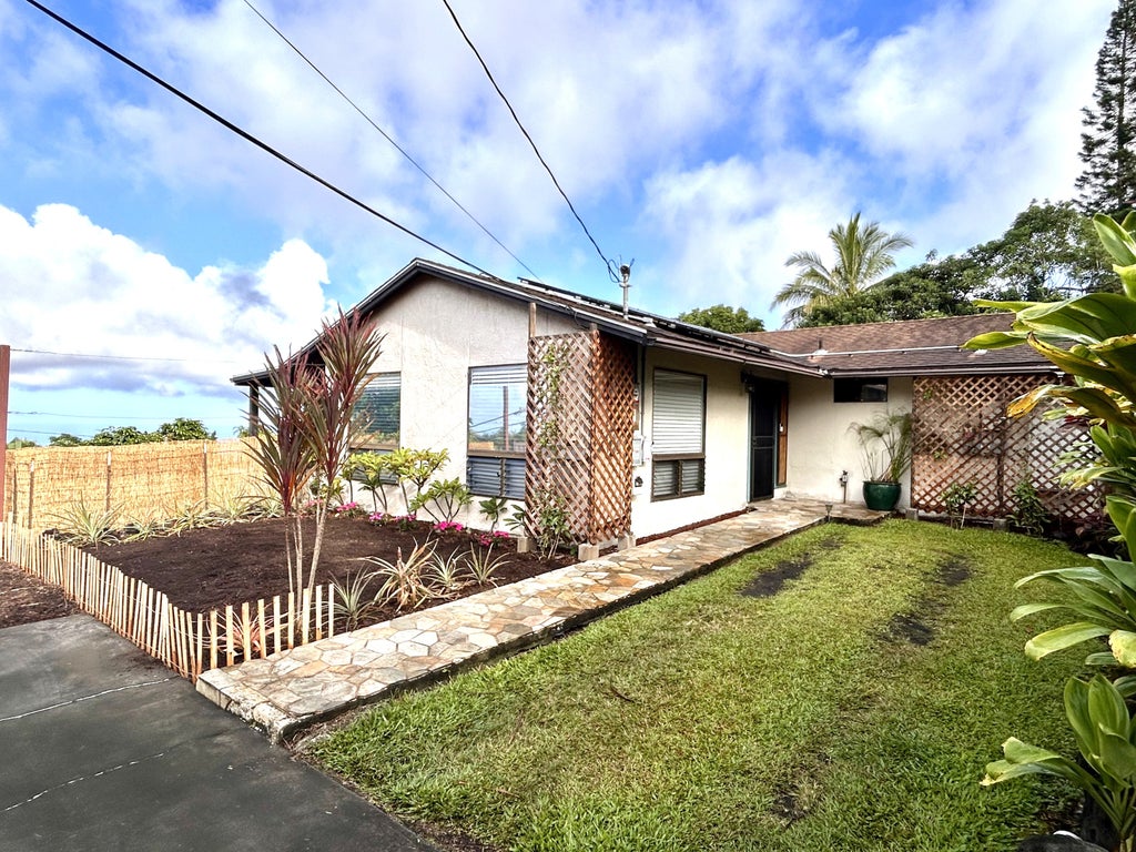 Located at a cool ~1540 ft. elevation above the airport, this clean 3/2 single level, hillside home has ocean views and cool breezes. This 17,000+ sq. ft. lot features plenty of extra space in both the front and back yards with yet another separate grassy area, with a covered lanai, perfect for kids or animals. The large front yard can easily accommodate 10+ cars and the extra large backyard can be accessed via a lower driveway or through the existing gate system and can be used for gardens, extra parking, or even to build another structure. Pineapples, figs, papayas, lilikoi, mint, ginger, bananas, dragon fruit, and avocados are on property.