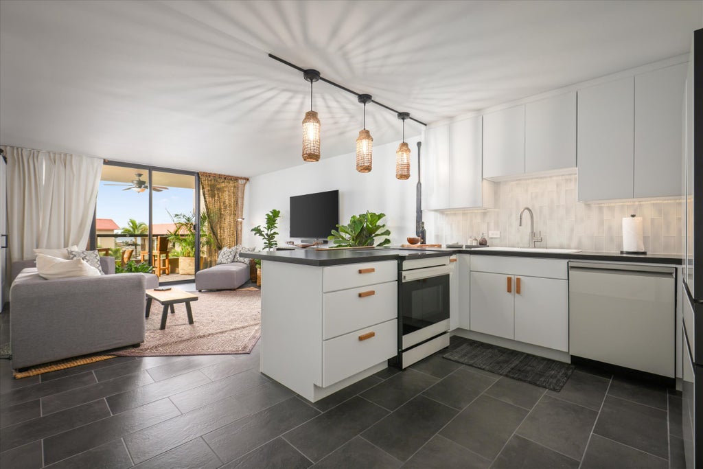 Newly remodeled luxury-designed condo in the heart of Kailua Kona! Spectacular downtown location within walking distance from nearby resorts, shopping, beaches, restaurants and the pier. This rare find and unique turnkey condo has been meticulously renovated from floor to ceiling in 2025. Professionally designed by Jean Marie Designs, this luxury condo boasts an open and flexible floorpan, bohemian / island inspired furnishings, with ocean views. Nothing left untouched, everything is new, no expense spared in remodeling the 1,194 sq ft 2 bed / 3 bath space. Full kitchen remodel including new Samsung appliances, leathered quartz countertops and brand new cabinetry. Each bedroom has a freshly remodeled ensuite accented with teak vanities, new tile, and high-end finishes. Offered mostly furnished with hand-picked Indonesian furniture, accent pieces, low maintenance plants, and light trim throughout. Enjoy outdoor living on the private and expansive walkout lanai from main living space and the bedrooms. Sliding barn doors offer maximum open flex space from the bedroom to living room with the option for privacy when needed. Each bedroom’s large sliding doors invite in tropical breezes and ocean views. Two assigned spaces in the parking garage are included with elevator access, making it wheelchair accessible. Whether you are looking for your next short term rental investment opportunity or a place to call home, this condo is move in ready! D624 in Kona Pacific captures the best of what the Hawaii life has to offer and is most appreciated when seen in person.