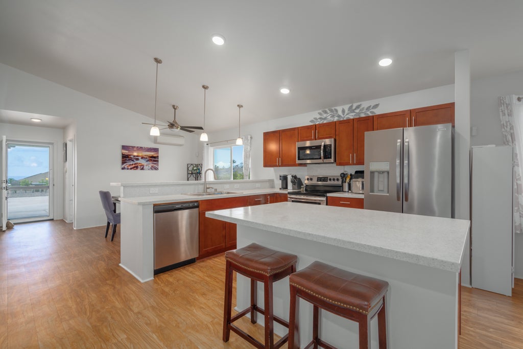 This home includes an attached two-car garage and has been upgraded with 5 split AC units, vinyl plank flooring and stainless steel appliances. At 568' elevation Wainani Estates enjoys sunshine, moderate temperatures and gentle breezes for a comfortable climate. It's close proximity to most of Kailu-Kona's attractions and landmarks means less car time; Kona International Airport is 8 minutes and Palani Street is 15 minutes away.