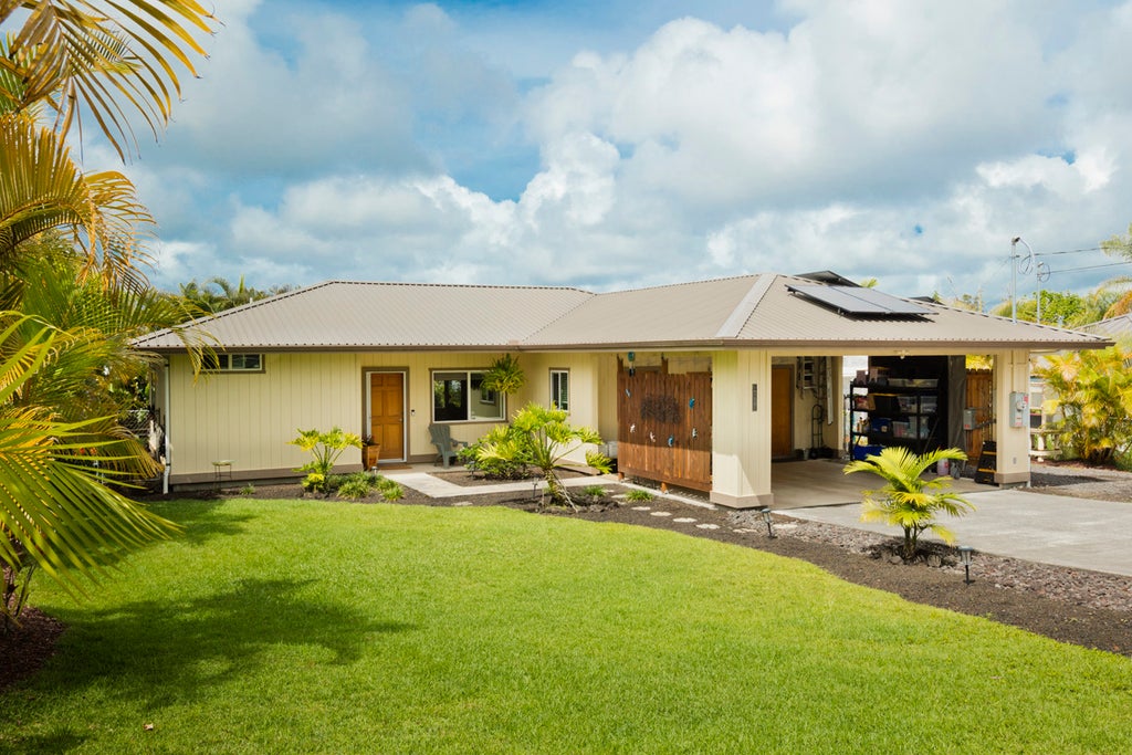 Don’t miss this beautifully maintained and thoughtfully upgraded 3-bedroom, 2-bathroom home located on a lush 12,000 sq ft fully fenced lot. The gate opens remotely with a Ghost Control remote gate opener. The moment you arrive, the stunning landscaping and mature fruit trees set a serene, tropical tone, while the attached garage and clean, modern design make everyday living a breeze. The list of fruit trees and plants is amazing! There are lemon, lime, banana, and papaya that are already producing fruit. The others should be producing in a year or two. This home is equipped with Lutron Caseta Whole House Lighting control and a Ring alarm system. Step inside to a bright, open living area featuring creative lighting and a high efficiency split air conditioner, and vaulted ceilings in the great room and custom window coverings throughout the home. Bathroom and bedrooms feature 9 ft ceilings. The 1,520 sq ft of living space includes a stylish kitchen with added cupboard space, perfect for those who love to cook or entertain. The enclosed back lanai provides the ideal space for relaxing, working from home, or enjoying indoor-outdoor living all year round. Sustainability meets comfort with a 24-panel solar energy system that dramatically reduces utility bills. The system, which is owned, also includes 3 2-year old Enphase Batteries that store plenty of power to run the house on a daily basis, while using HECO occasionally, for backup when batteries are not fully charged. The property includes two spacious storage buildings and a covered planting/workbench area—ideal for gardening, hobbies, or additional workspace. There is a conveniently located greenhouse right near the covered work area. This home truly offers the best of both worlds: modern conveniences, eco-conscious features, and the charm of island living.