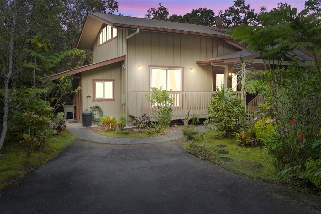 Must-See Property nestled in the lush rainforest of Ohia Estates, this delightful 2-bedroom, 1-bathroom home offers 1,024 sq ft of living space on a tranquil forested lot. Built in 2003, the home features a spacious loft with a half wall overlooking the living room, creating an open and airy atmosphere. The grounds are meticulously landscaped, boasting over 100 orchids interspersed with native ferns and ohia trees, providing a serene and private Hawaii lifestyle.