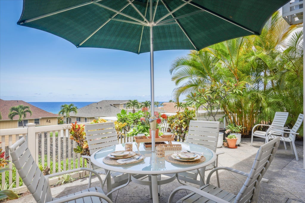 At the top of Alii Cove is this beautifully kept condominium, with special features such as an outdoor landscaped patio with ocean views, turn key furnished 3 bedroom and 2 bath, central A/C, designed with spacious closets, pantry, and kitchen cabinets. 1st floor and end unit adds to the desirability of the private location and quality condition inside and out. Salt water infinity Pool, hot tub with spacious exercise room and dining area for outdoor BBQ dining, adds to the island life-style we all appreciate.