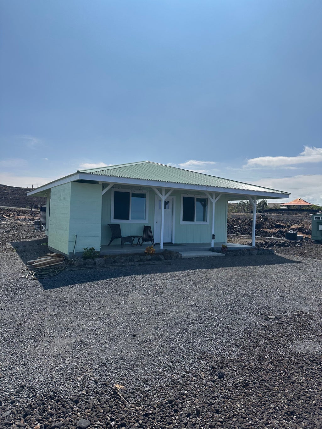 This stylish 1-bedroom, 1-bath home features 528 sq ft of interior space with a solid hip roof and 144 sq ft of covered front lanai—perfect for soaking in the island breeze & views. The interior has brushed epoxy concrete floors, custom tile work in the walk-in shower, solid surface kitchen counters, and generous cabinet storage. A 1600-watt solar power system and backup generator support off-grid living.