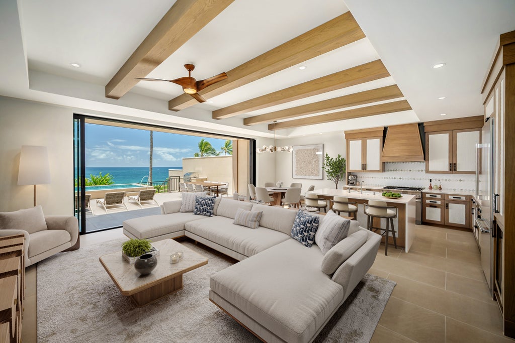 Laola Nani 2002 is a new 3 bedroom/3.5 bath ocean view townhome showcasing breathtaking views of the shimmering waters of the Running Waters Bay and the Ninini Pt. Lighthouse. Here, relaxation is waiting to welcome you home. These gorgeous 2-story villas frame the prized oceanfront hole #15 of the signature Nicklaus designed Ocean Course and feature tropical contemporary design with elements such as custom wood cabinetry and natural stone countertops. The disappearing floor to ceiling glass doors create seamless indoor/outdoor living opening to a generous lanai with private plunge pool and built-in BBQ. The kitchen is a chef's dream with Thermador Pro Grand Series appliances, wine/beverage cooler, custom mosaic tile backsplash and quartz countertops. The photos are virtually staged. Custom furniture package is available.