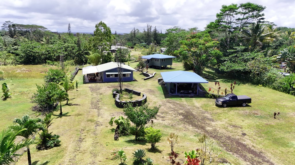 Nestled on a full acre in Hawaiian Paradise Park, this charming property offers a blend of creativity, flexibility, and privacy—now fully fenced and ideal for pets, gardening, or simply enjoying the peaceful surroundings. Located on 8th Avenue, just minutes from Keaʻau town and an easy drive to Hilo, the property features mature landscaping, multiple structures, and room to grow—both literally and figuratively.