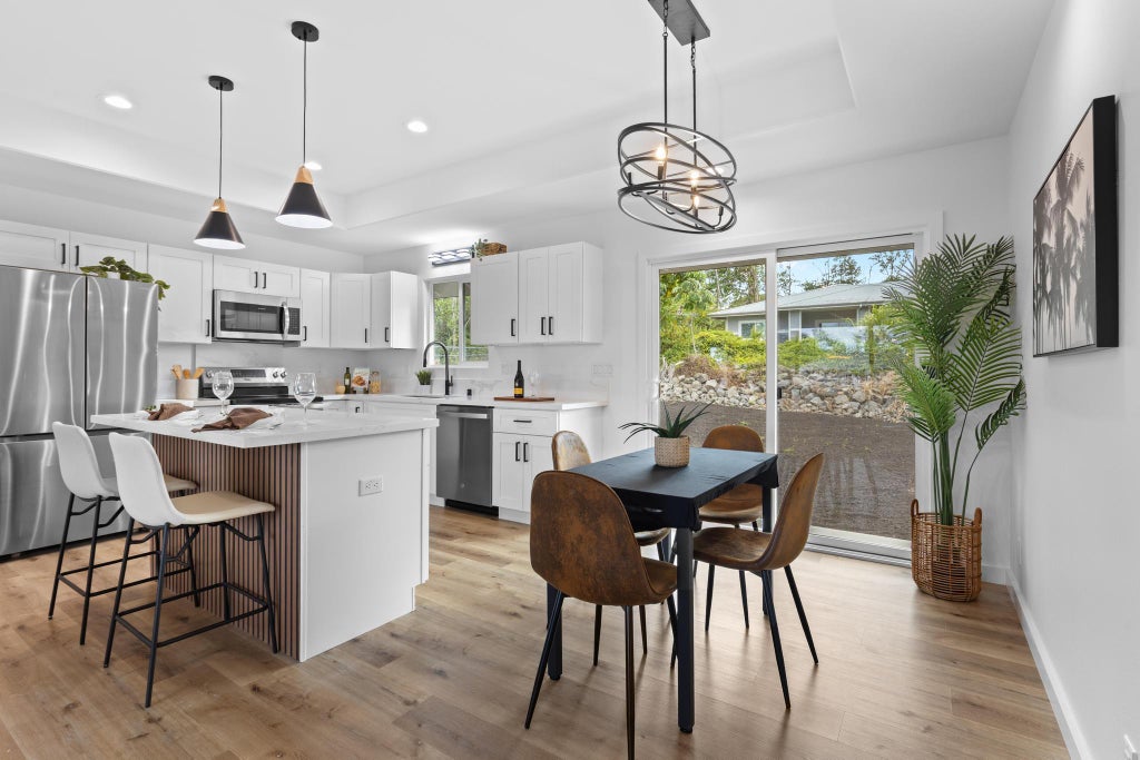 Step inside to discover an open concept living area with modern flooring and a striking accent wall that adds warmth and character to the space. The kitchen is outfitted with sleek brand new appliances, solid countertops, and new cabinetry, making it ideal for both everyday living and entertaining guests.