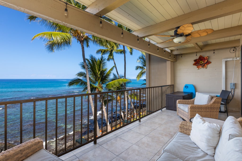 This third-story air-conditioned condo is so close to the ocean it’s like having an aquarium at your doorstep. You can actually see yellow tangs swimming in the water below. Relax on your lanai and watch surfers, dolphins and Kona’s famous sunsets, too. Video tour: https://my.matterport.com/show/?m=LnGRW7e8nhE&mls=1