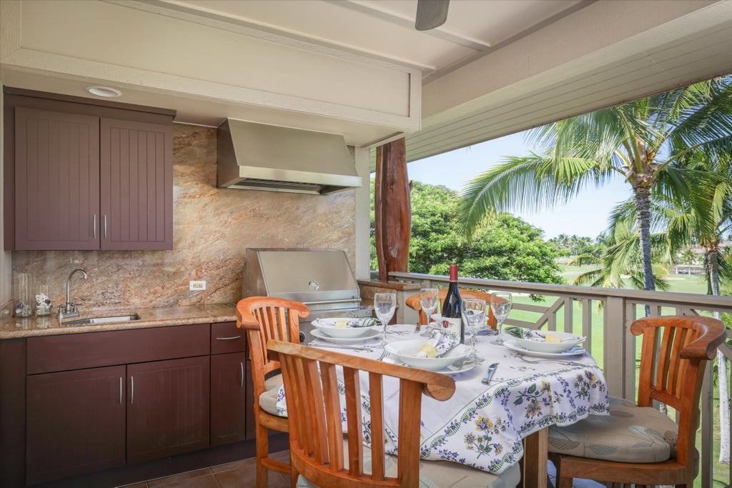 Penthouse Villa, L-33 is a spacious, 1209 SQFT, Turn-key townhome, with 2 bedrooms, 2 bathrooms, overlooking the 3rd hole on the Waikoloa Beach Golf Course. This penthouse Villa includes a private garage, and an additional parking spot. Keep your vehicle and toys locked in the garage and have your guests park in front of the garage. The kitchen has an open floor plan, lots of natural lighting, granite countertops, cherry finished cabinets, and stainless steel appliances. The Primary suite offers vaulted ceilings, remodeled master bathroom with an extra large walk in shower, dual vanities and a walk in closet. On the lanai, enjoy your built in Viking Grill/kitchen with prestigious golf course views with tropical landscape.