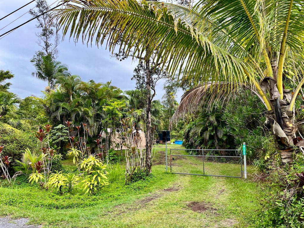 One-acre parcel in Hawaiian Paradise Park offering an off-grid lifestyle with sustainable features. Mature trees, established landscaping, and a defined driveway lead to multiple structures, blending privacy and convenience.