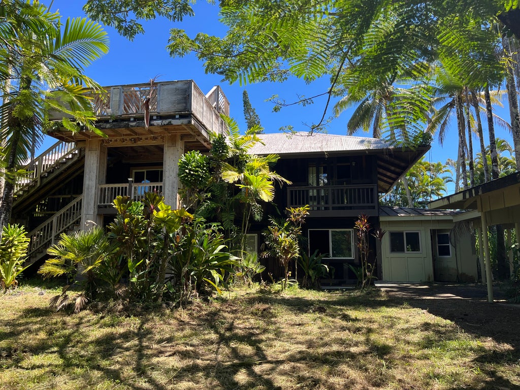 Relax & Listen to the distant Ocean from this personal Hawaii Resort Like property that has a remodel started. Design and create your paradise amongst 40+years of mature landscaping. Restore this 2 story redwood construction home with lots of windows and custom folding sliding doors that open up to a wrap around deck. At one time this property had views of Mauna Kea & Hilo Bay. This is the last property on the makai (ocean side) of the road bordering over 4,305 acres of Shipman property. Fully fenced when seller purchased although it may need some updates or replacement in sections to bring it back to life. This home has 2 bedrooms 1 bathroom upstairs with an open Kitchen and Living room with a wrap around deck. Downstairs is more of an open slate as it has a few rooms including a storage room and a bathroom. There is a covered carport and also room for 10+ cars to park if needed or build a garage or workshop. So many possibilities on this mature landscaped property. Enjoy many varieties of palms, varieties of Croton, Ulu, Avocado, Mangosteen, Black Bamboo, Ti Plants, Banana, Cacao (Chocolate), and a Coconut Palm for your pleasure.