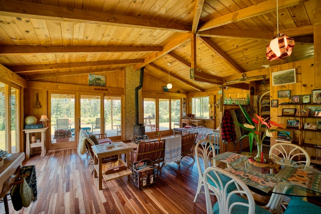 Welcome to Kopua Farm Lots in Mountain View, offering a serene off-grid lifestyle on a meticulously cared-for 20-acre parcel. Nestled amidst enchanting ohia trees, this property features four custom-built wood cabins, each uniquely crafted with exotic woods and reclaimed vintage elements.