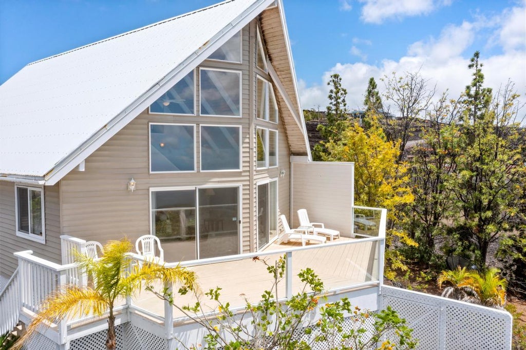 Welcome home to a "million dollar view" for a fraction of the cost. This Lucky Bennet design is a beautiful concept which is ideal for island lifestyle. This lightly lived in 1770 sqft 3 bedroom 2 bath is in pristine condition. The home is situated on a meticulously landscaped acre in a great part of the subdivision with nice homes located near by. This home exudes peace and tranquillity with white interior open beam ceilings, large windows and sliding glass doors that provides a view of the islands natural beauty. As you open the entrance door to this home you are greeted with a gentle Hawaiian breeze and graced with tile floors and large hallways that lead you straight to the heart of the home. One will find themselves gravitating to the large deck that overlooks the Ka’u forest reserve with unobstructed views of South Point all the way down the coastline. Two of the rooms are on the main floor along with the kitchen and bathroom, living room and dining room. Main level bedrooms have large deep closets and are good sizes, and laundry is in the hallway closet for convenience. A staircase then leads you to the upstairs loft which is the 3rd/primary bedroom with a big walk in closet with cedar lining and a separate bathroom. The Kitchen is open concept and contains clean white appliances with cherry wood cabinetry/shelving and a breakfast bar. Deck is large with glass panels so you can still enjoy unobstructed panoramic views while sitting. There is a detached garage with lots of storage perfect for parking a car or a "man cave" or "she shed". The whole acre is beautifully landscaped, walkable with flowers and mature trees. The home features a large 22k gallon water catchment tank, irrigation on timers and built on post and pier with additional storage space underneath the home. Don't miss out on seeing this elegant home, you'll be impressed. **See 3D virtual tour and view the video tour at https://show.tours/v/s7RqTqN?b=0