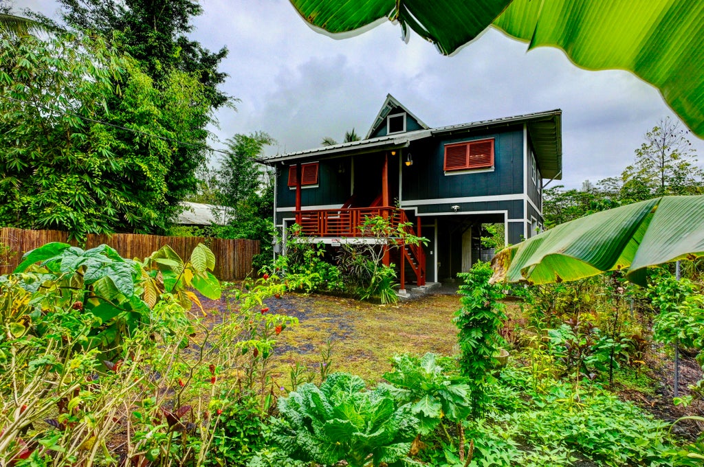 This darling fully permitted two bedroom, two bathroom home packs a real punch in upgrades with new appliances throughout, an EV outlet/receptacle to charge your electric car and a complete Quantium Disinfection® water system for your 10,000 gallon catchment tank. The charming curb appeal of this elevated home welcomes you in and the warmth of REAL hardwood floors throughout with Ohia posts and beams creates an inviting sense of comfort and style that is a nod to Hawai'ian living. The entire interior has been recently painted as well as the front steps and back lanai. The private and expansive back lanai is the pinnacle of peace and quiet and is surrounded by forested land and treetops for miles. Hang your hammock and sway your troubles away while watching the moonrise and stunning star scapes.